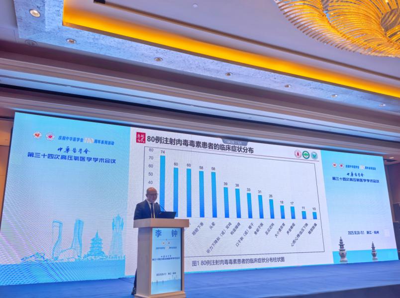 2025年11月1日我院高压氧中心在杭州举办的中华医学会第三十四次高压氧医学学术会议上进行了《高压氧治疗注射性肉毒杆菌中毒临床疗效评估》大会发言。李钟副主任分享了我院在肉毒中毒领域中的研究进展,受到中华医学会高压氧医学分会专家高度评价,一致认为我院相关探索为"肉毒中毒的精准防治开辟了新路径"。